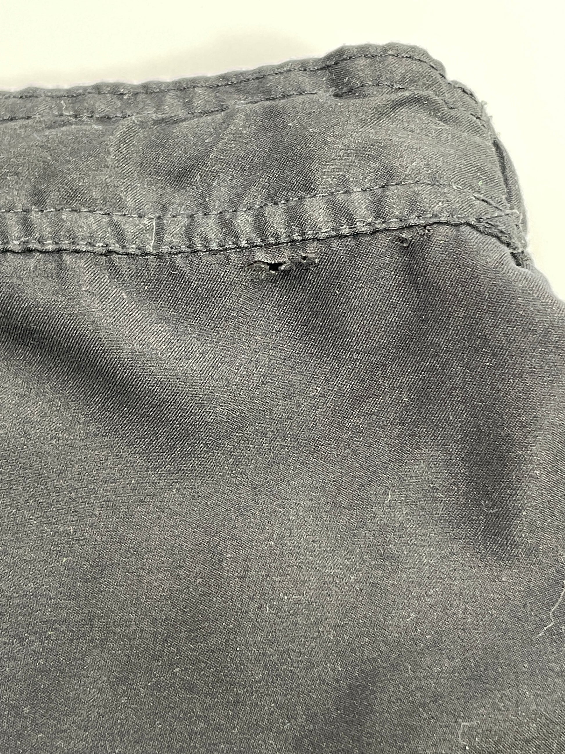 There are small holes on each hip. Possibly from a tagging gun where the original product tag was attached.