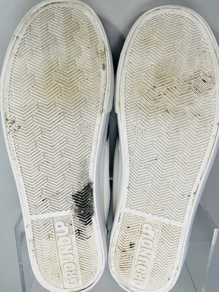 Shows wear with staining and skid marks along the white rubber soles.