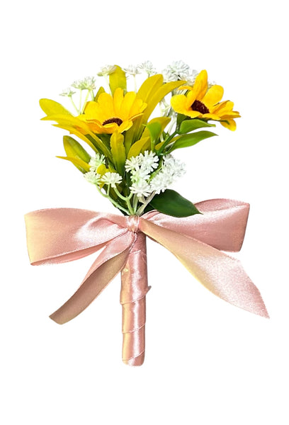 HANDMADE Sunflower & Babys Breath Wedding Groomsman Boutonniere with Magnetic Clasp with Rose Gold Bow