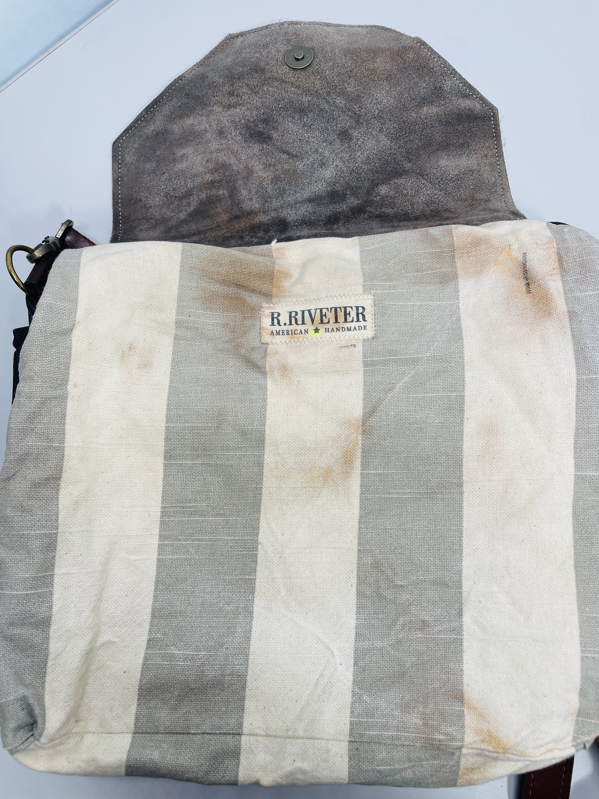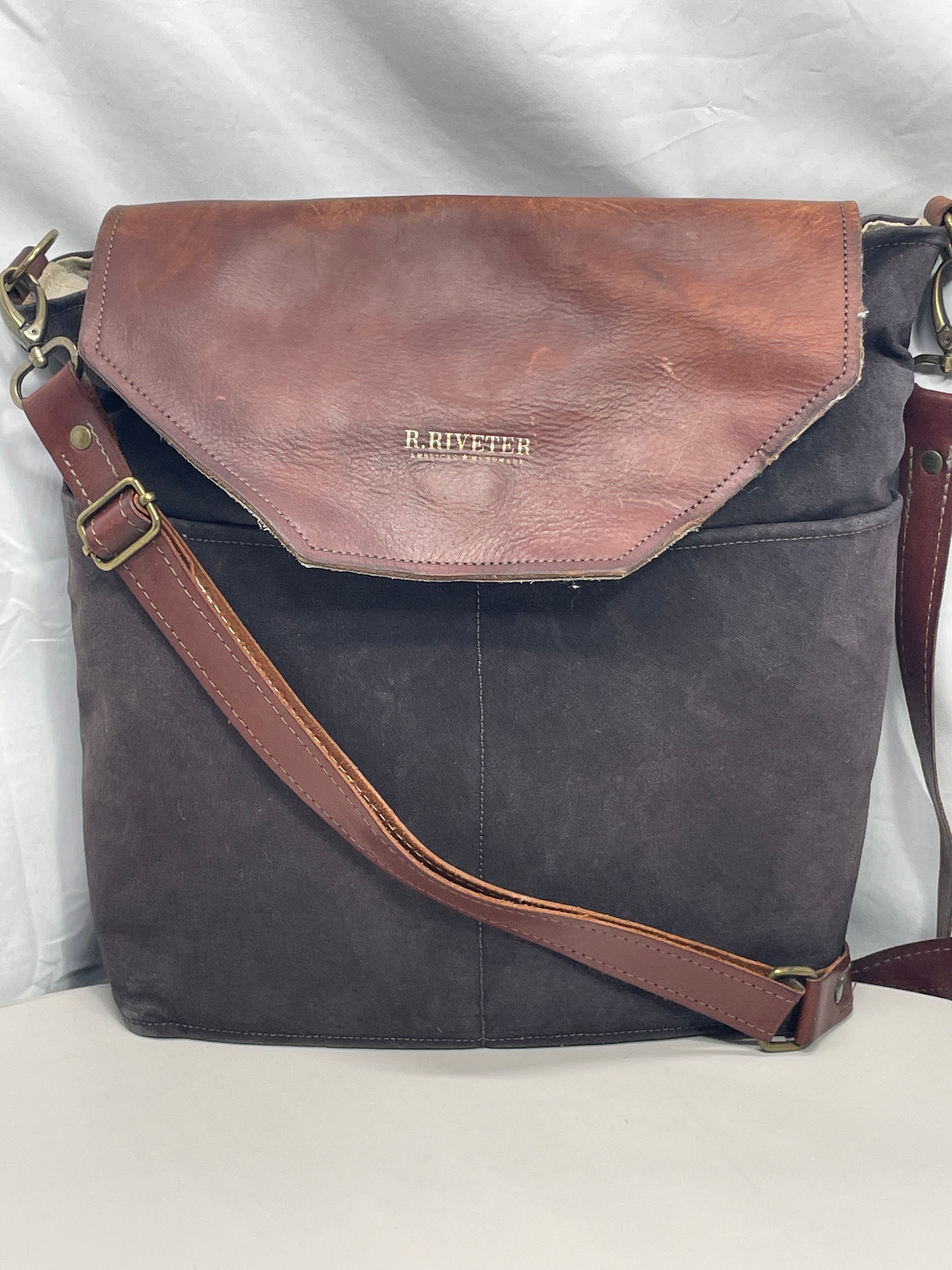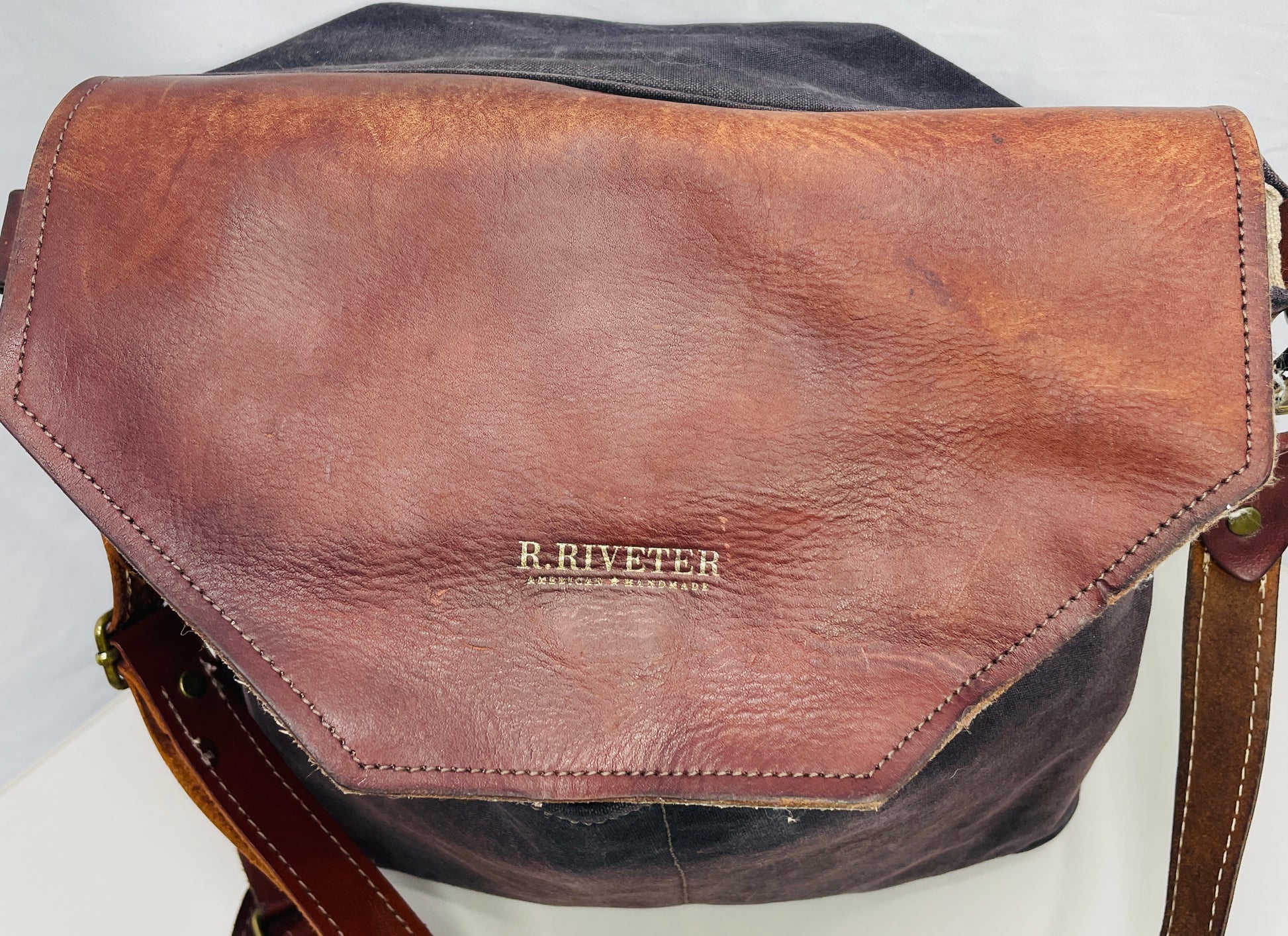 R.Riveter Original Canvas Handbag Purse Black with Leather Flap Distressed Extreme Wear Messenger Bag