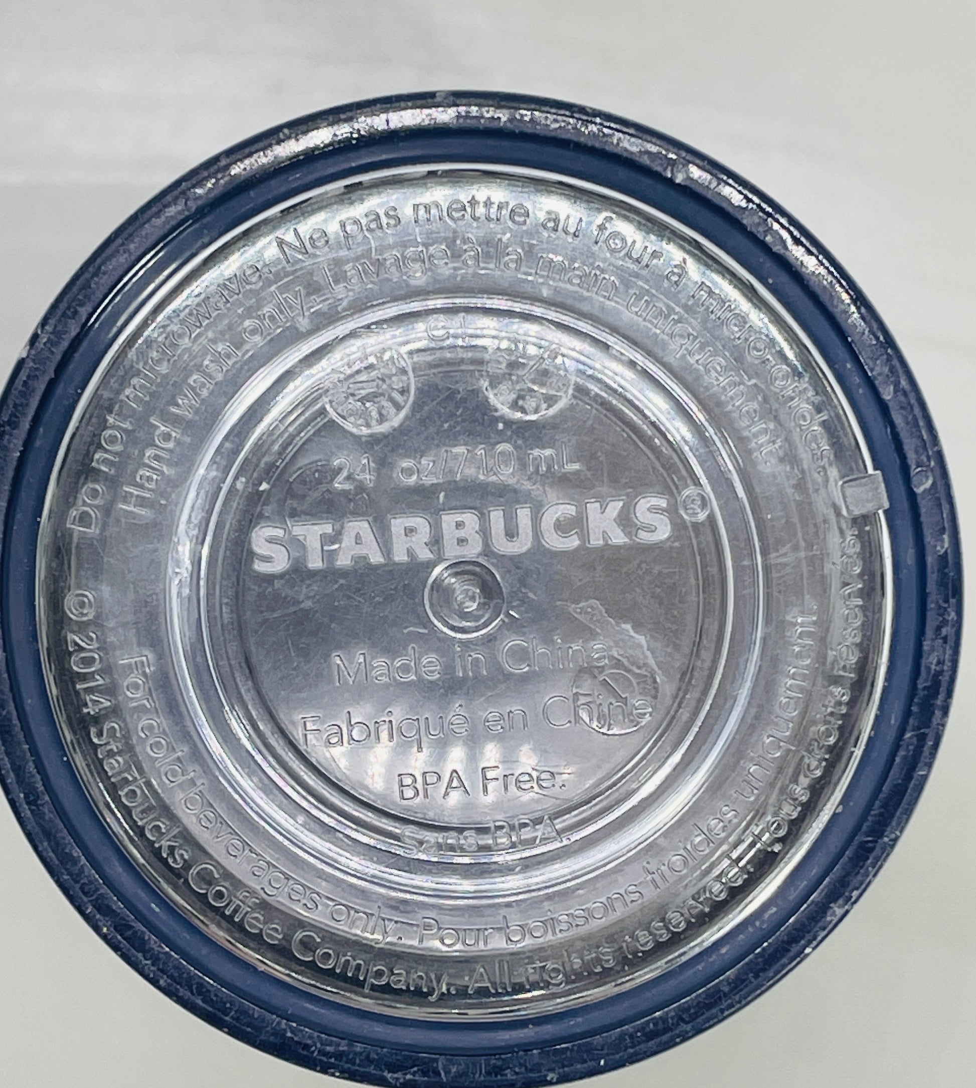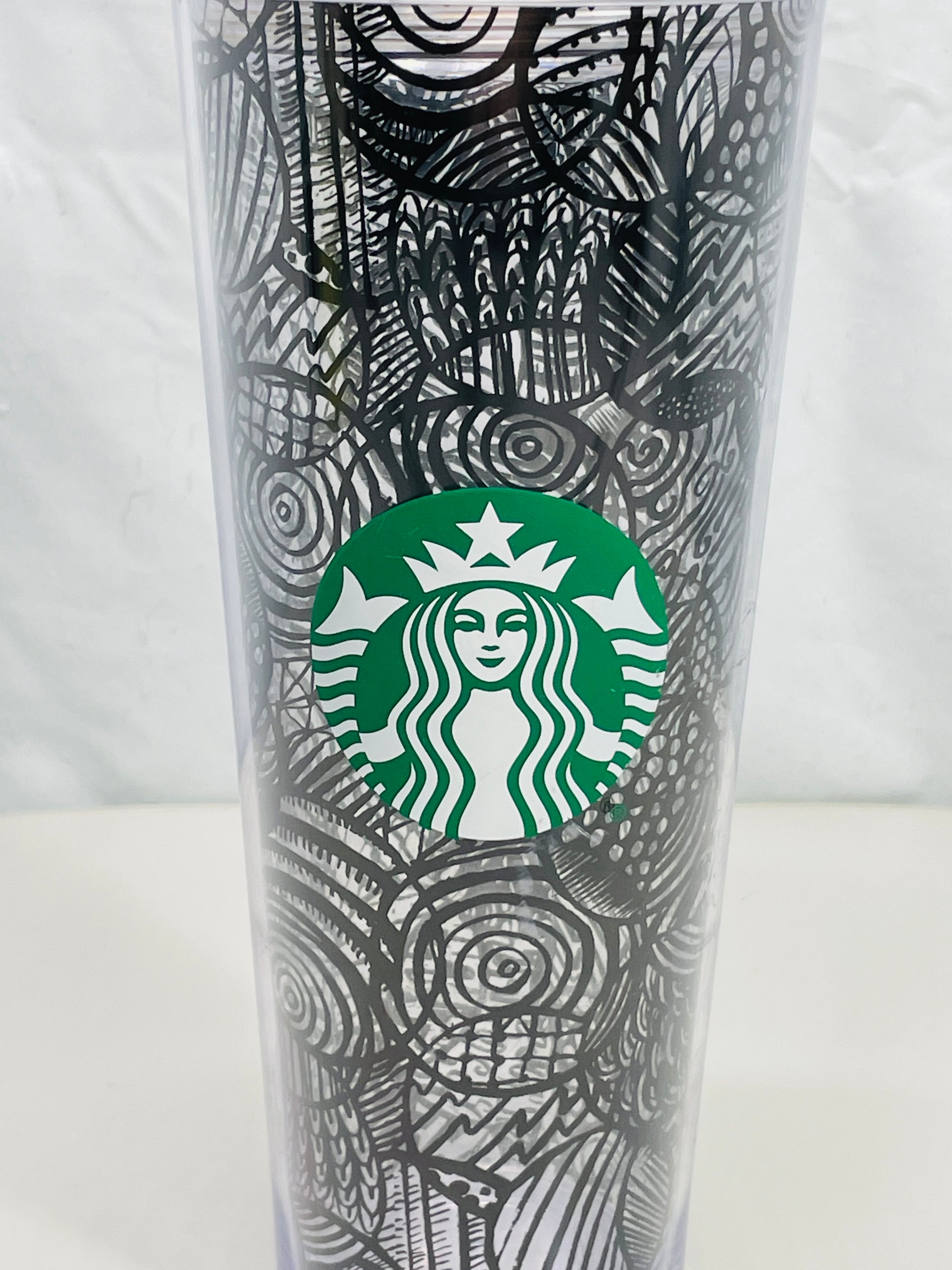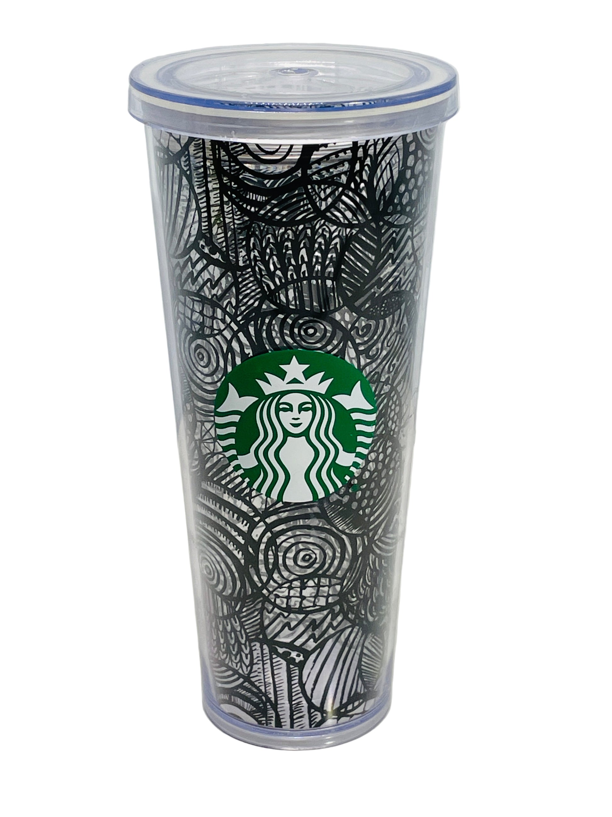 Starbucks 2014 Cold Tumbler Clear Acrylic with Black Circles 24 oz Lt scratching No Straw