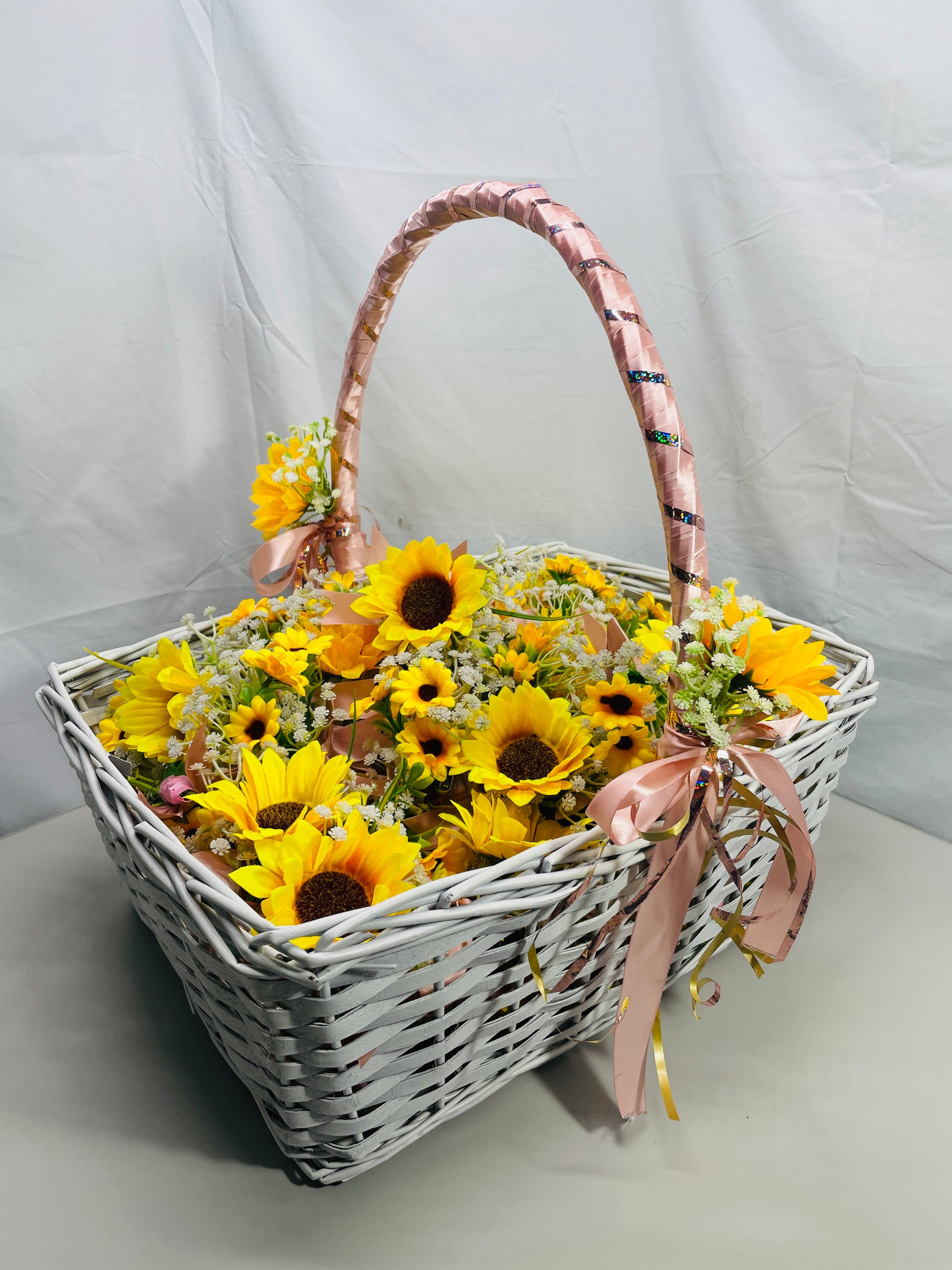 113 Premade Handmade Boutonnieres - Large White basket with Handle Rose Gold Pink Ribbons