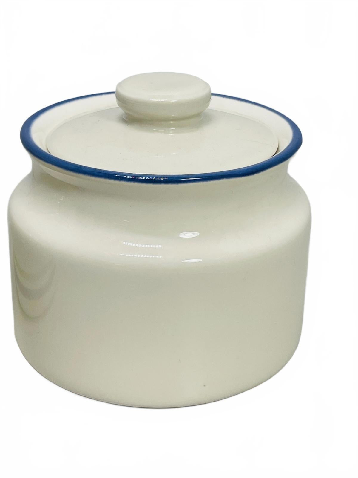 VINTAGE 2 PC Cream/Sugar Bowls Ceramic Beige with Blue Stripes 3" x 4"