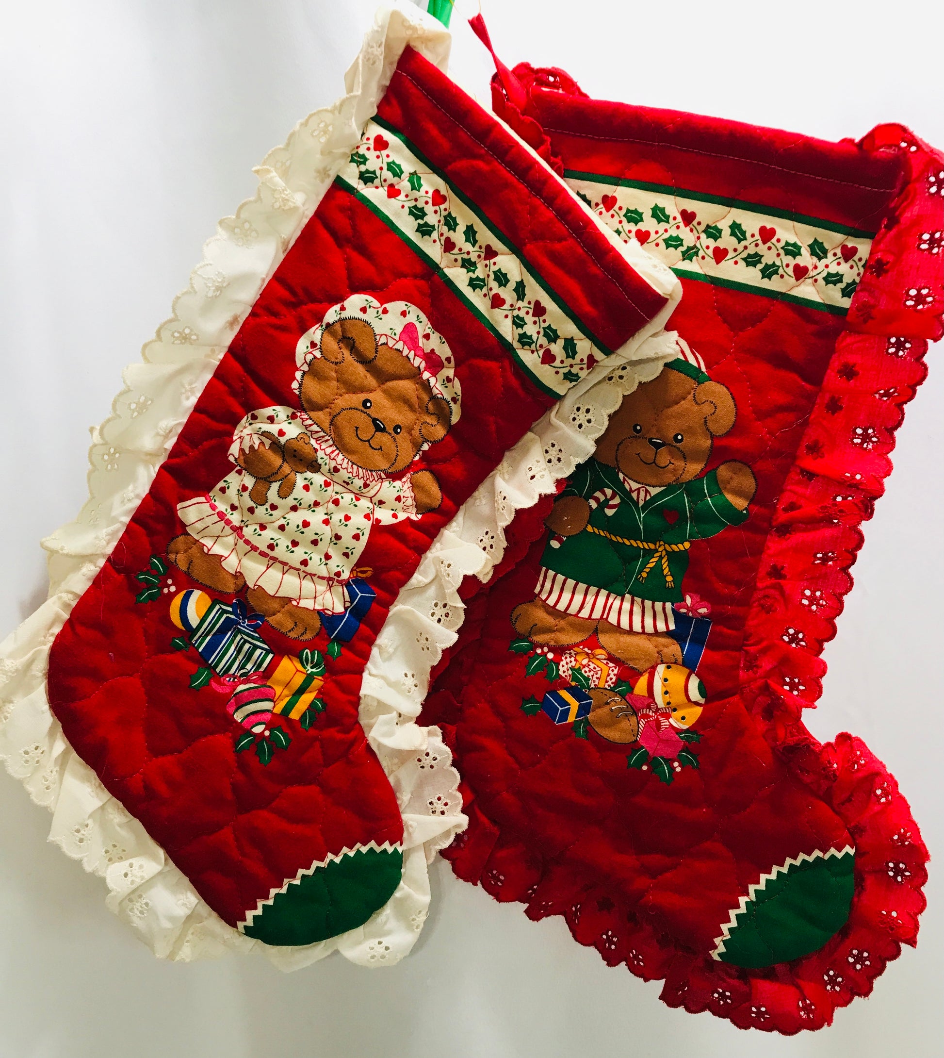 Vintage Handmade Christmas Stocking SET Red Quilted With Mr & Mrs Teddy Bears Lace Trim
